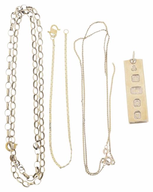 the ingot approx. 14.5 grams and suspended from a large link 9ct gold belcher chain, together with a thin 14K gold bracelet and a thin 9ct gold neck chain (3)