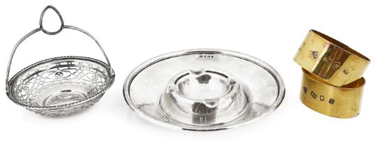 A selection of Edwardian and later silver, napkin rings, ashtray and trinket basket