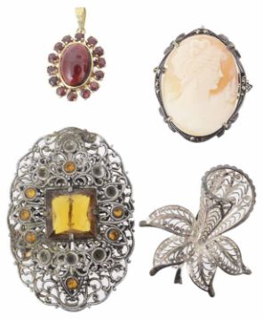 together with a silver and marcasite set cameo mounted brooch, a silver filigree floral brooch and a paste set dress brooch (4)