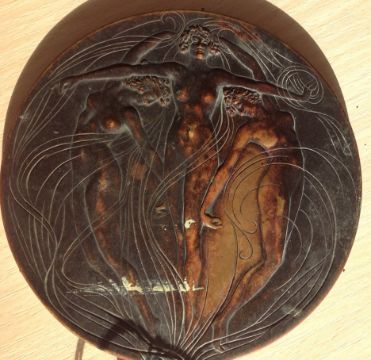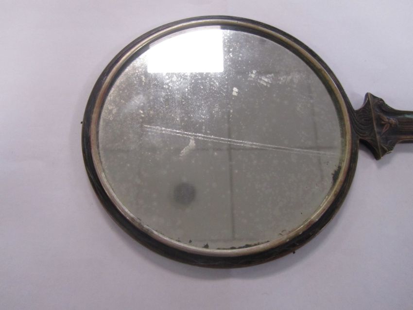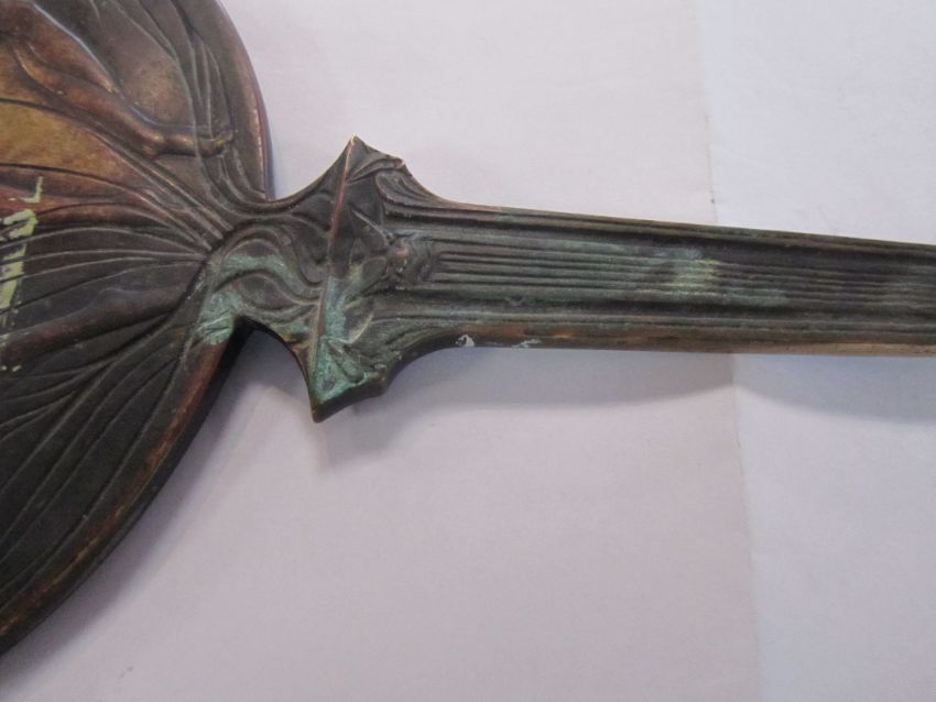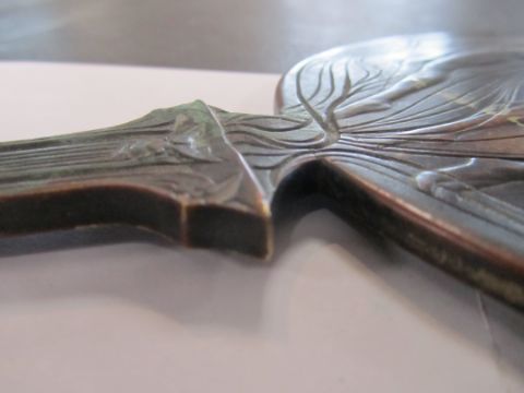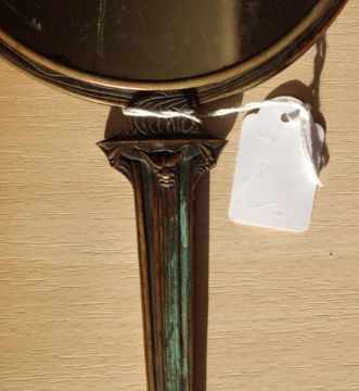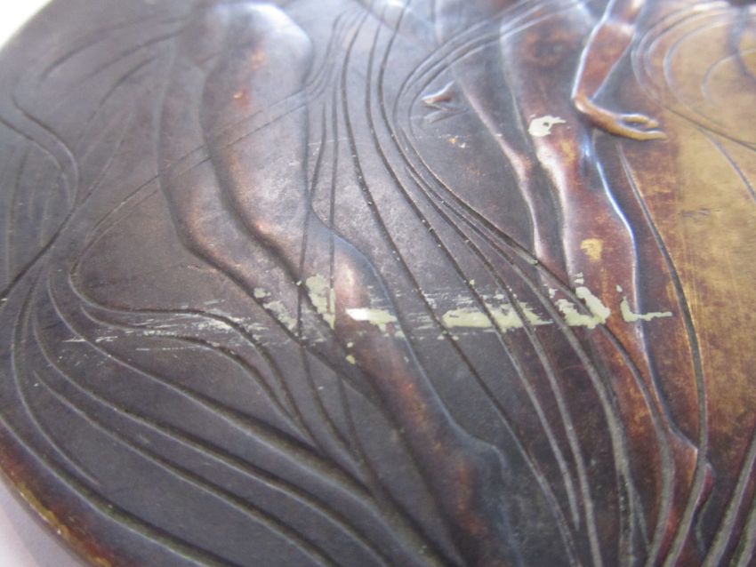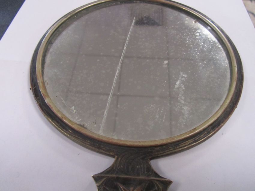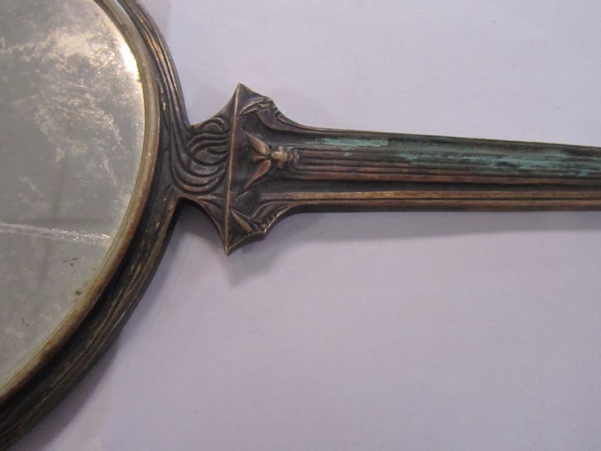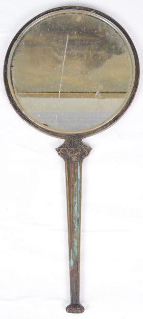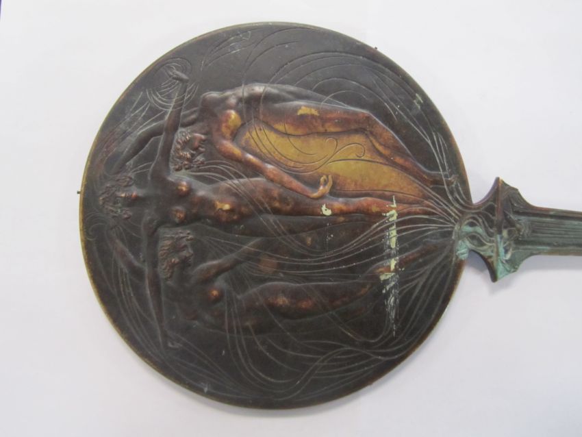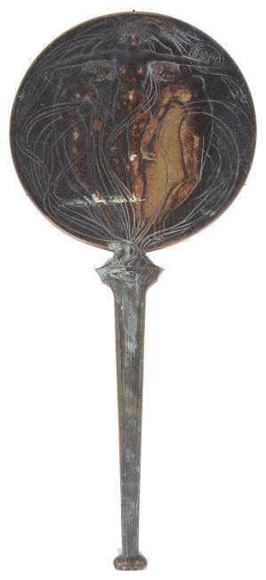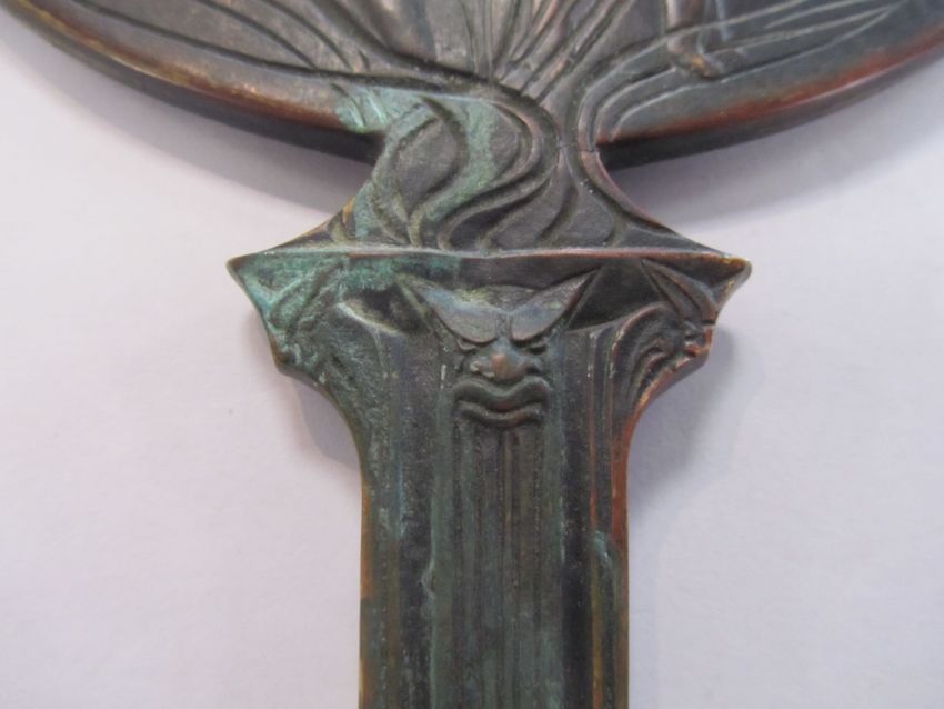 A rare bronze hand held mirror by René Lalique circa 1910cast with three graces on the circular section amongst swirls, the handle cast with a devil figure, stamped on the side Laliquelength 33.5cmCondition: Heavily tarnished and in need of a good clean. The mirror with a significant scratch approx 11cm. Silvered worn at edges of mirror, signs of paint on the reverse of the frame, scratch down the centre of the mirror glass.