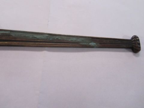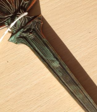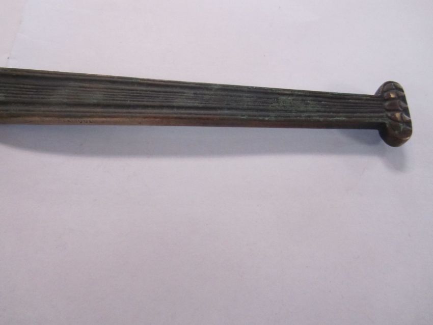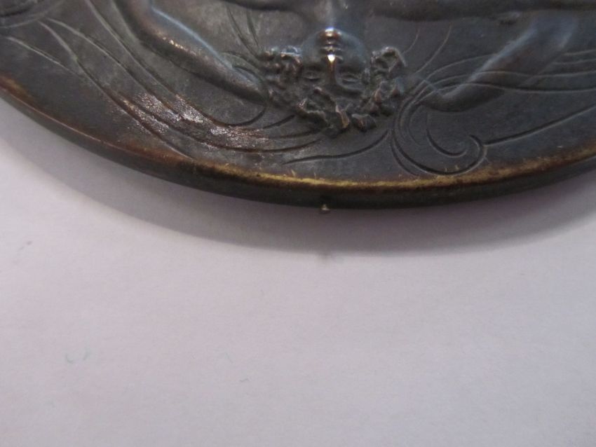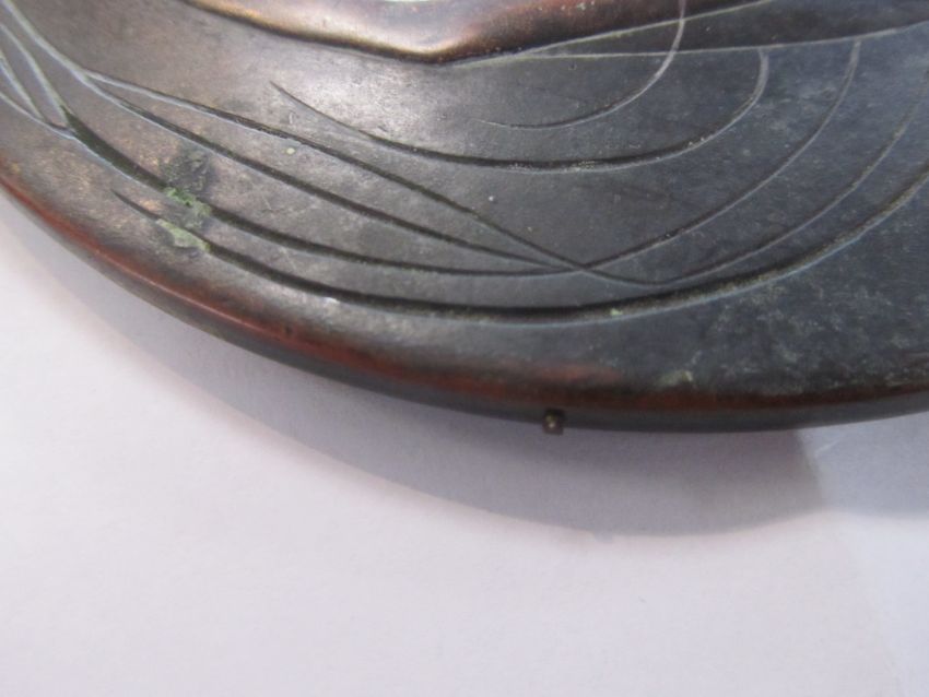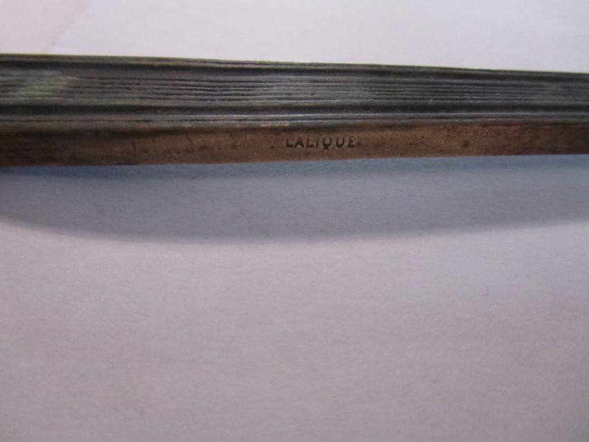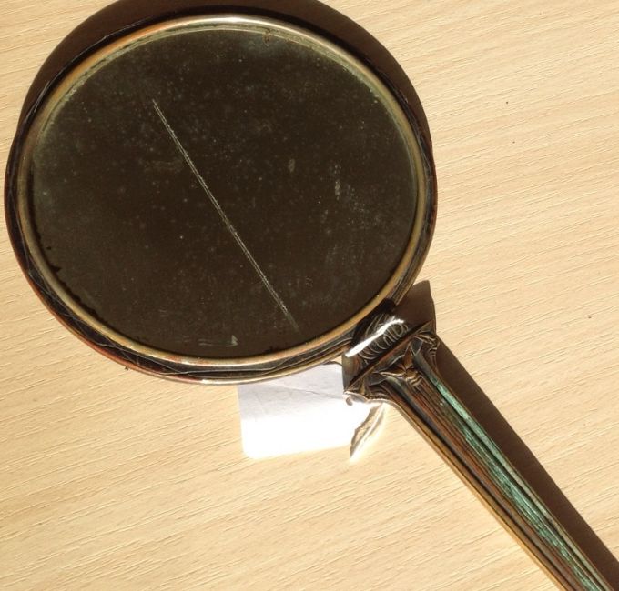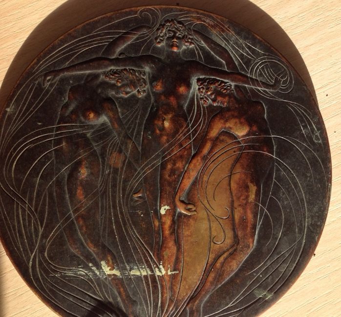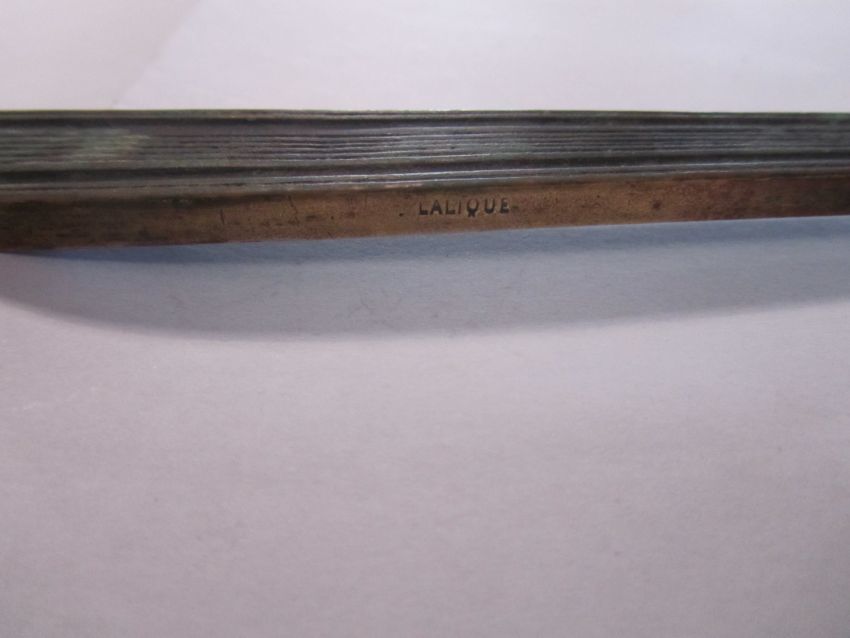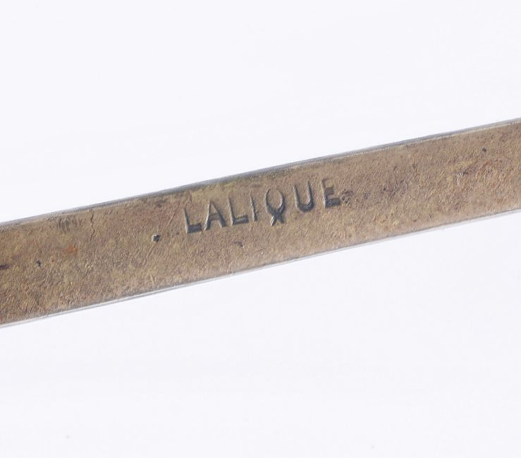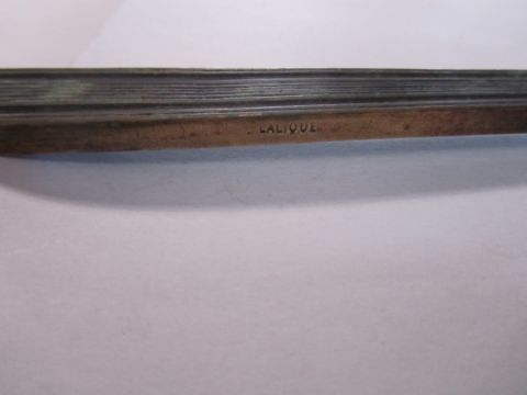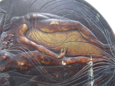 A rare bronze hand held mirror by René Lalique circa 1910cast with three graces on the circular section amongst swirls, the handle cast with a devil figure, stamped on the side Laliquelength 33.5cmCondition: Heavily tarnished and in need of a good clean. The mirror with a significant scratch approx 11cm. Silvered worn at edges of mirror, signs of paint on the reverse of the frame, scratch down the centre of the mirror glass.