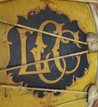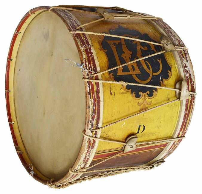 painted Hawkes & Son Makers 28 Leicester Square London, with painted cartouche with interlaced initials LCC, drum skin 30in