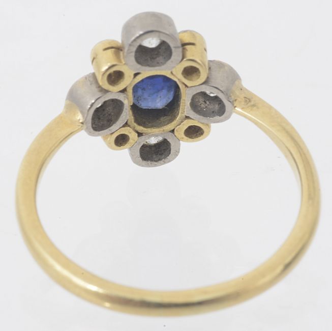 having central oval sapphire within collet mounted diamonds in a quatrefoil setting, yellow and white 18ct gold and platinum mount