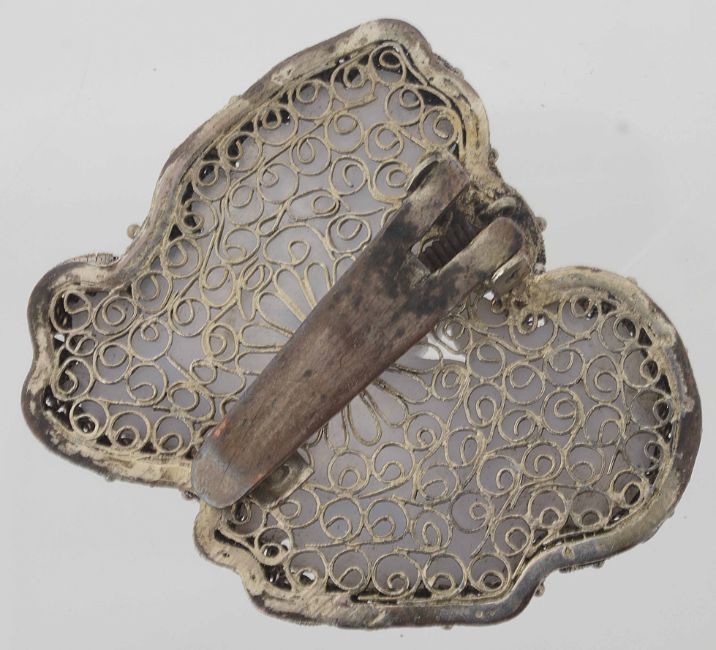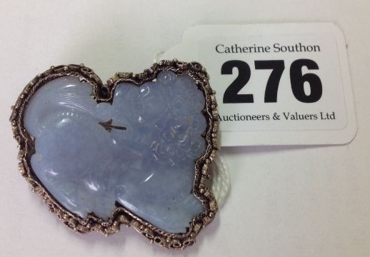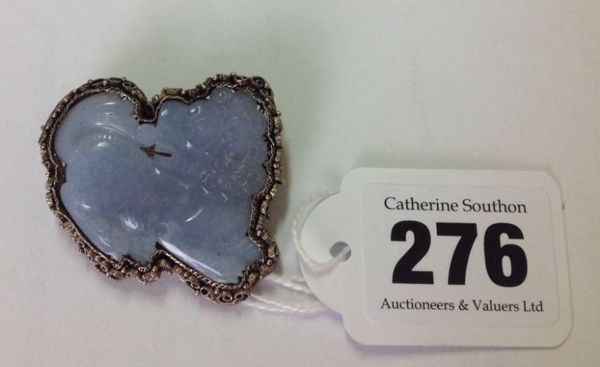 the jade panel carved as a kirin and mounted in a white metal filigree clip mount, stamped China to reverse, clip testing for silver on copper
