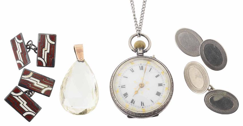 together with two pairs of silver cufflinks, one with red and white enamelled geometric patterns, the other of oval form with simple chased design; and a silver fob watch with enamelled dial on metal chain (4)
