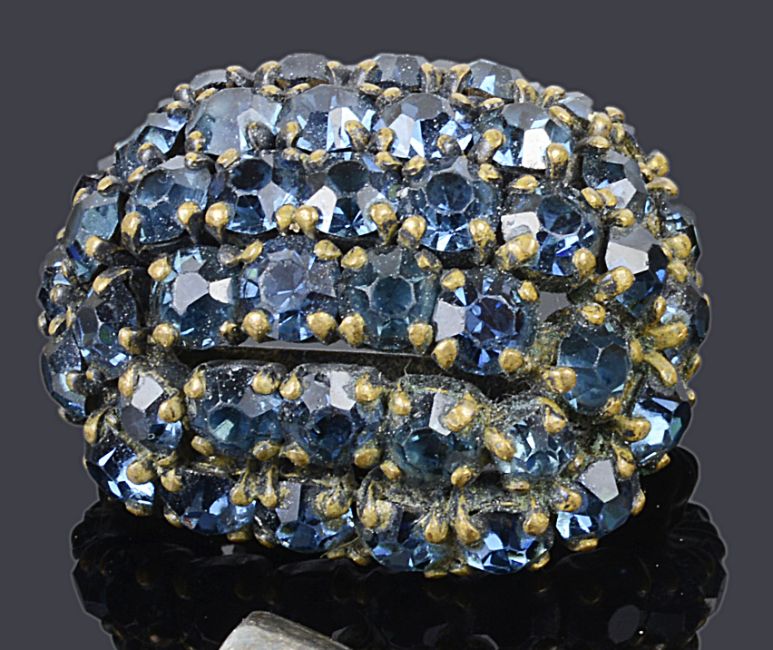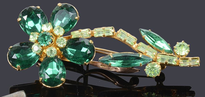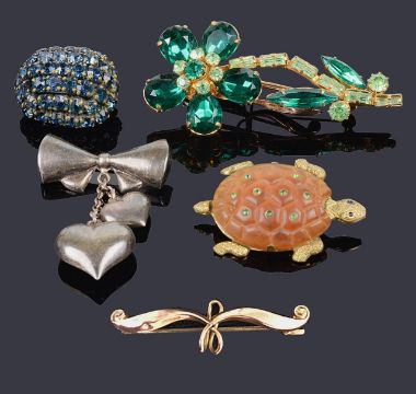 together with a 9ct gold fob brooch, a silver double heart pendant brooch and two other rhinestone set costume brooches (5)