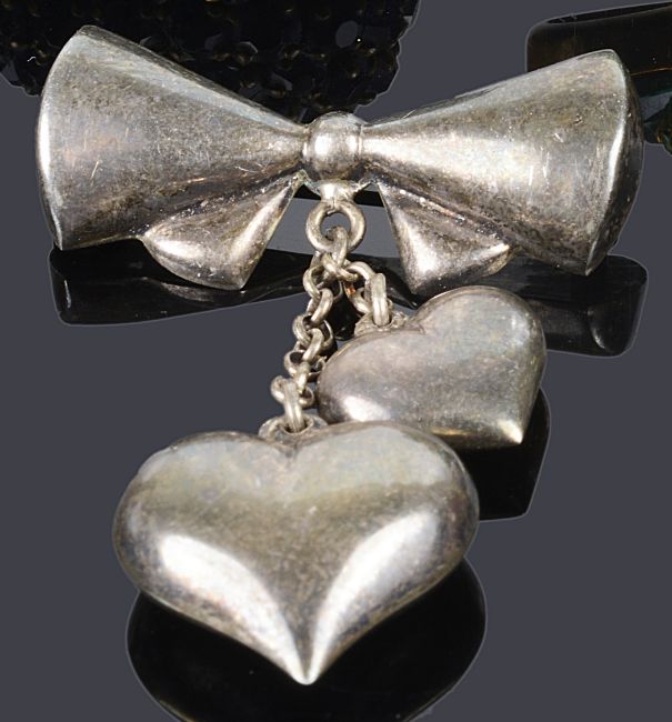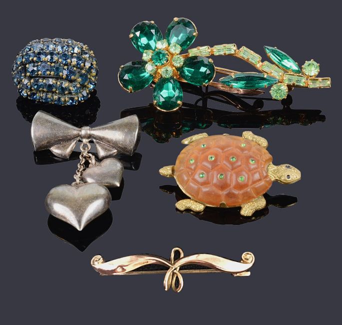 Condition: Bow brooch a little tarnished but closes well. 9ct brooch with small dent, tortoise missing one stone