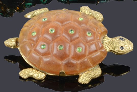 An amusing Art Deco poured glass and gilt turtle pin brooch