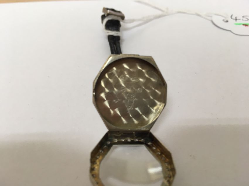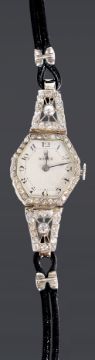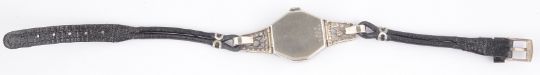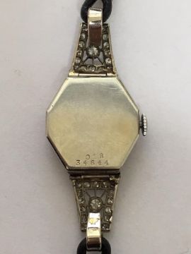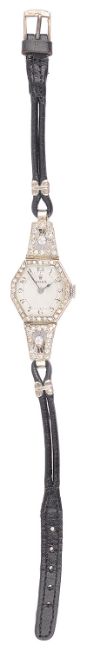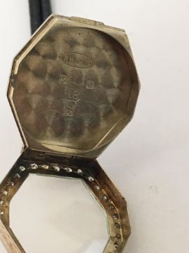 the engine turned dial with Arabic hours, spade hands, in an octagonal case inset with a row of diamonds, with two hinged diamond inset sections holding leather strap, case number: 018 34644, hallmarked 18 .75, in associated box.