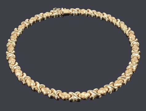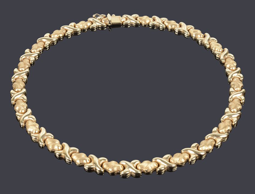the articulated necklace formed of alternate brushed scroll and polished cross link sections and with invisible push clasp fastening, stamped Italy .585, maker B & M