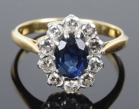 the central oval sapphire set within a single row border of diamonds, mount tests for gold