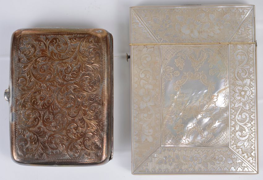 An Edwardian silver cigarette case and a Victorian mother of pearl card case