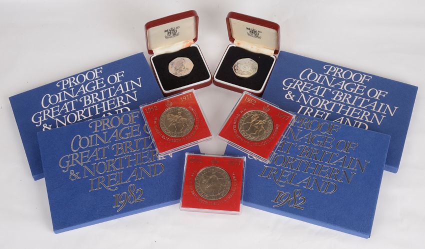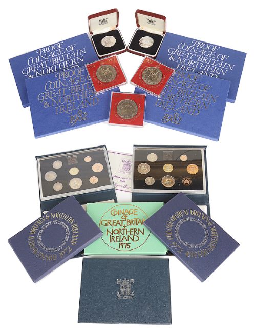 1975 Coinage of Great Britain & Northern Ireland, cased; 3 x 1977 HM Queen Elizabeth II Silver Jubilee crowns, cased; 4 x 1982 Queen Elizabeth II proof coinage of Great Britain & Northern Ireland; 2 x 1983 Queen Elizabeth II eight coin collection, cased; 1984 UK proof coin collection, cased, (qty).