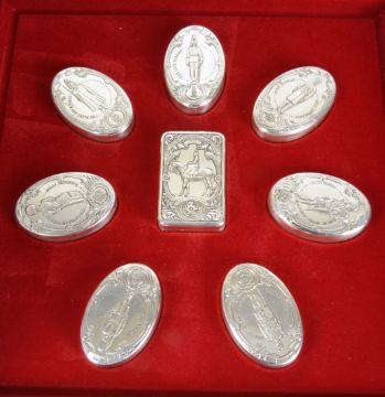 seven of oval form and one of rectangular form, each lid embossed with regiment motifs and regiment name, each hallmarked Sterling silver with import mark, in a fitted case, together with certificates in cardboard envelope, (8)