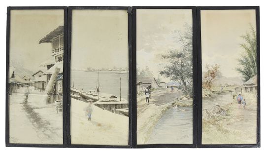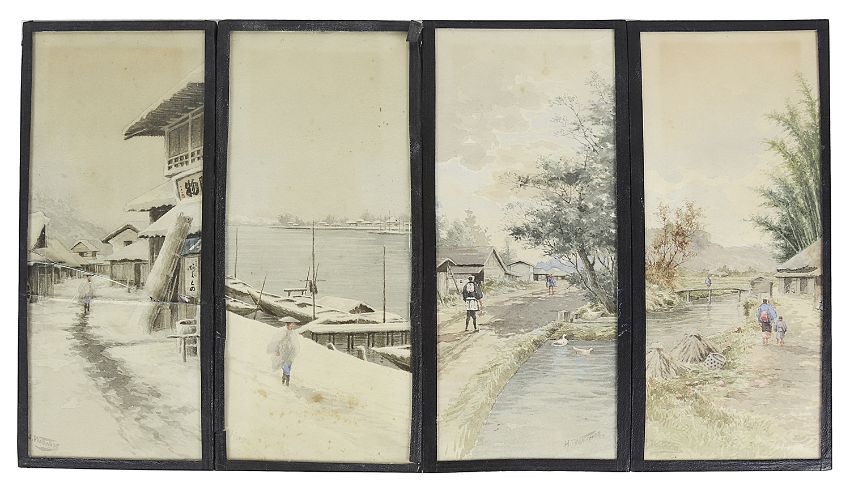 two landscape and river scenes and a snowy street scene, watercolours, each signed, together with another similar snowy river scene, watercolour, signed Hobhio? and two further Japanese river scenes, charcoal, unsigned and another, a/f, (7).