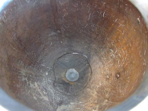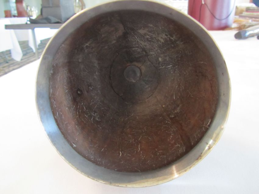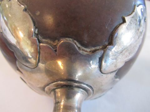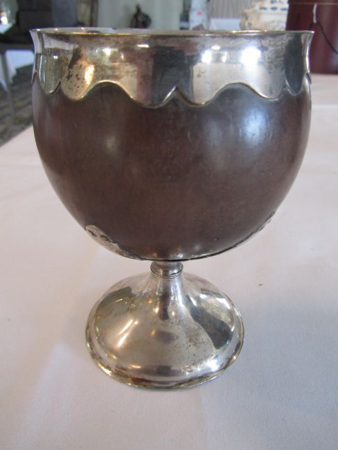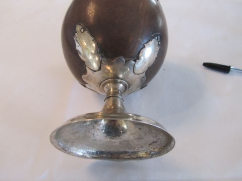 Condition: Fair, with wear throughout, there is a crack in the base of the coconut, dents to the circular foot ring, repair to pedestal base above reeded section on the pedestal.