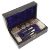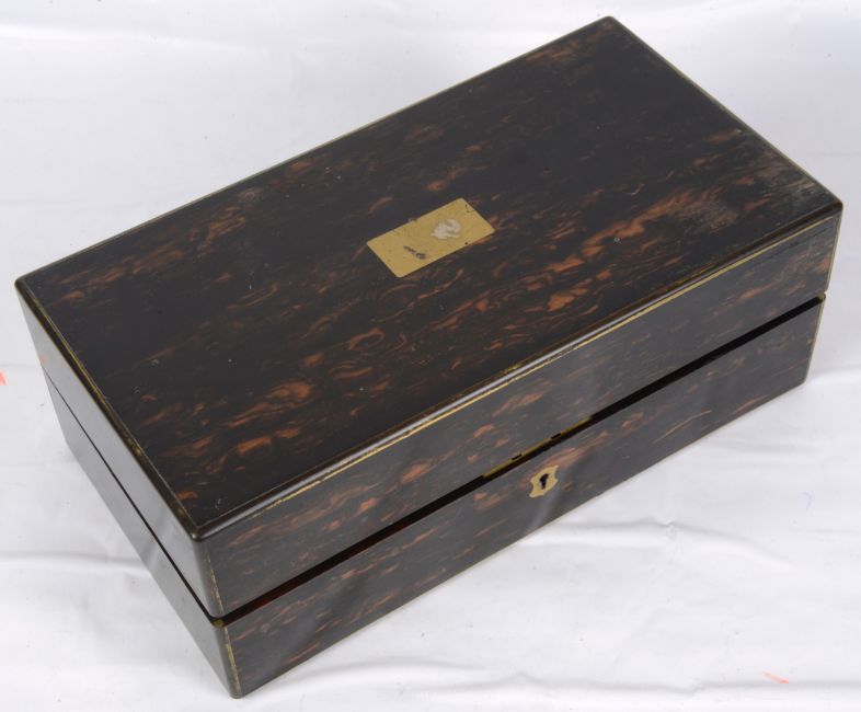 Condition: Fair to good, with wear to the exterior of the box, water damage to the right corner of the hinged lid, wear to the gilt metal banding, minor wear to interior.