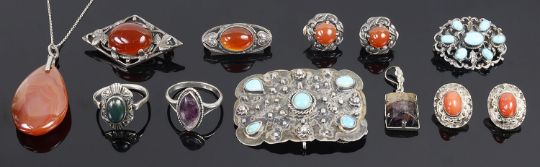to include two carnelian foliate set brooches, two Art Deco silver mounted rings, carnelian drop pendant on silver chain, silver carnelian ear clips, coral ear clips, two silver and turquoise brooches and a blue john pendant (qty)
