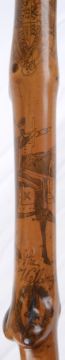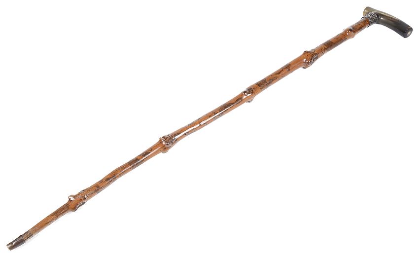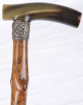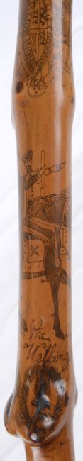 the horn handle above a silver foliate embossed collar hallmarked London 1894, upon a knopped wooden shaft extensively engraved with the Royal Crest over the Duke Of Wellington on horseback, above the inscription 'His Grace Duke of Wellington' with regimental figures on horseback amongst faces, a lion and unicorn motif above the metal ferrule.