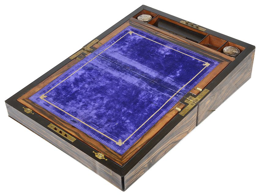 the lid inlaid with cartouche inscribed with interlocking initials and dated 1868, the lid lifting up to reveal lined writing slope, pen tray and silver metal topped ink bottles
