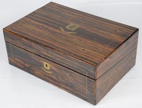 Condition: The inside slope needs some attention. Split to coromandel wood to lid. In fair to good condition.