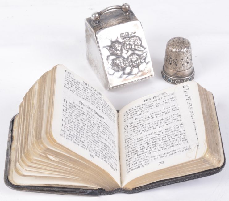 with hinged door revealing a velvet padded ring holder, the hinged door embossed with the Reynolds Angels; together with a George V silver thimble hallmarked Chester 1913 by Charles Horner, of typical form with foliate decoration and an Edwardian silver cased Common Prayer book, hallmarked Birmingham 1903 by Percy Frederick Jackson, the front cover embossed with the Reynolds Angels, (3).