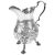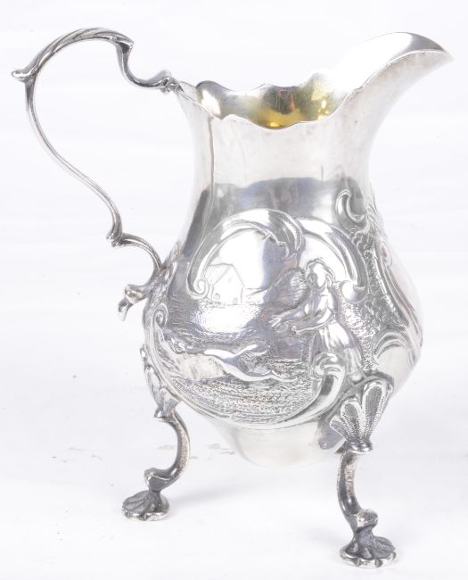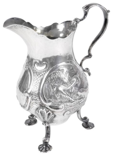 of typical form with c-scroll handle, the body embossed with a lady and dog chasing pheasants amongst rushes, with engraved armourial in a c-scroll cartouche, raised upon three c-scroll supports with pad feet, possibly by William Robert Smily.