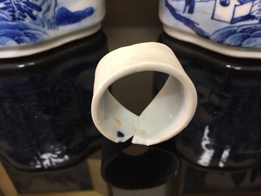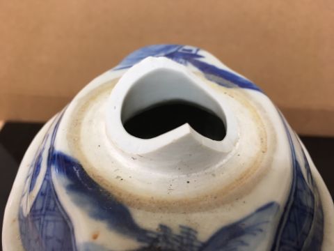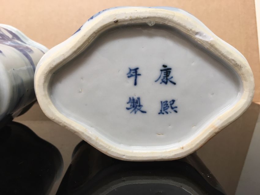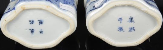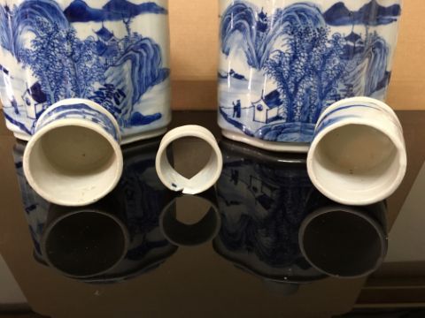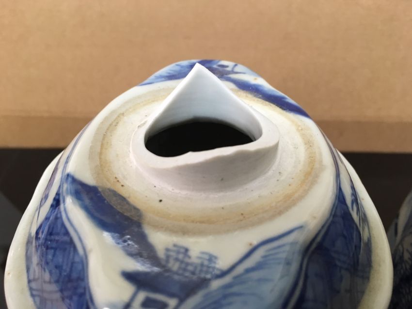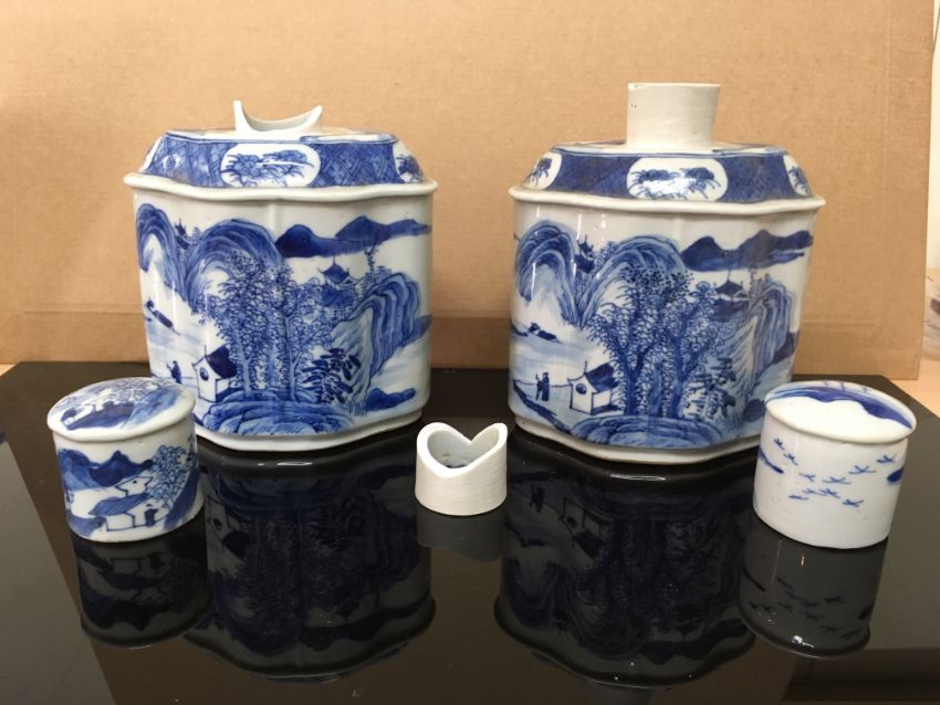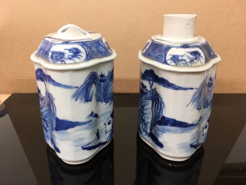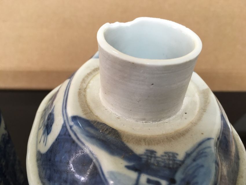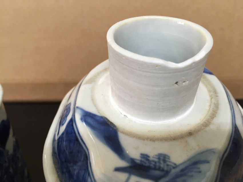 Condition: One bottle neck damaged, one bottleneck with large chip, otherwise no restoration or damage to the body of the tea poys.