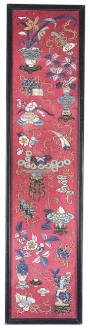 the single band embroidered on a red silk ground with shaded blue silk floss and gold couching, the band embroidered overall with Taoist precious objects and blossoms, framed
