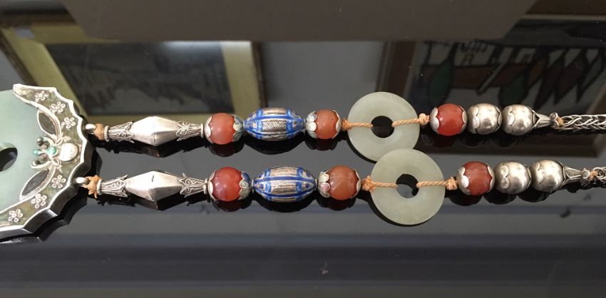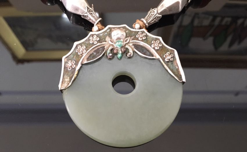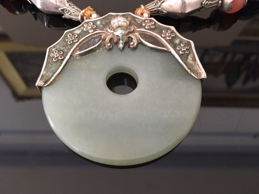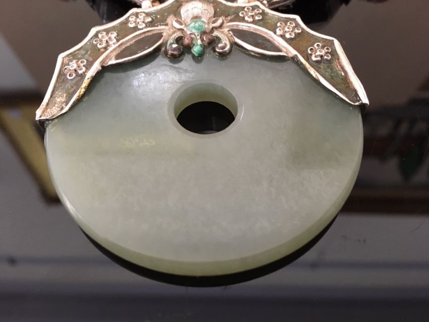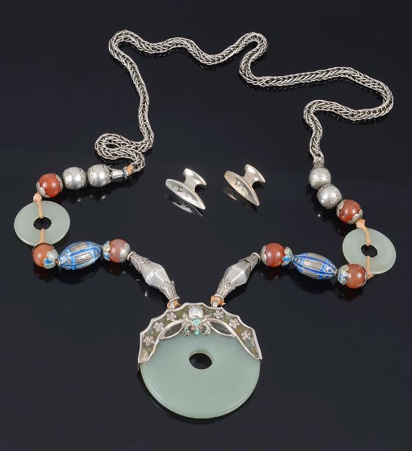 An early 20th century Chinese jade, silver and enamel pendant necklace
