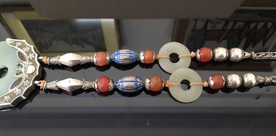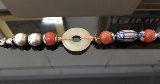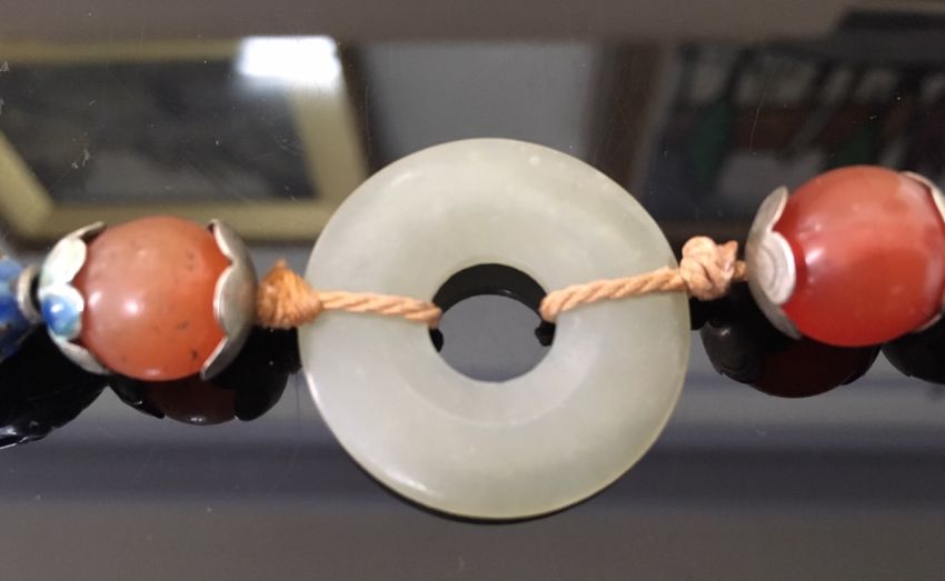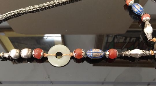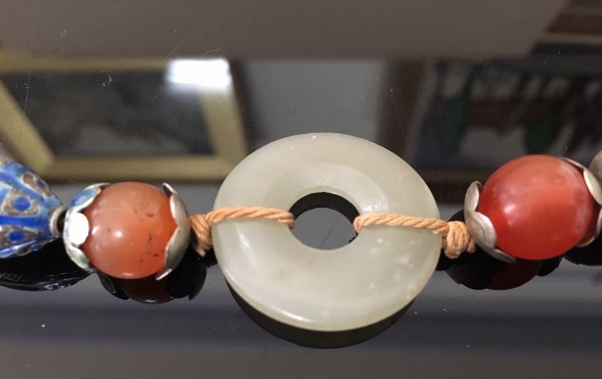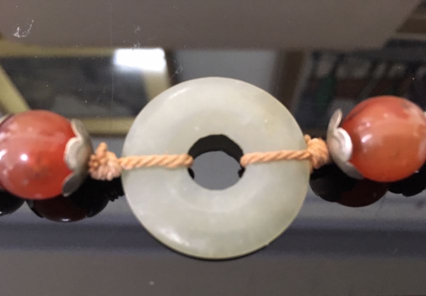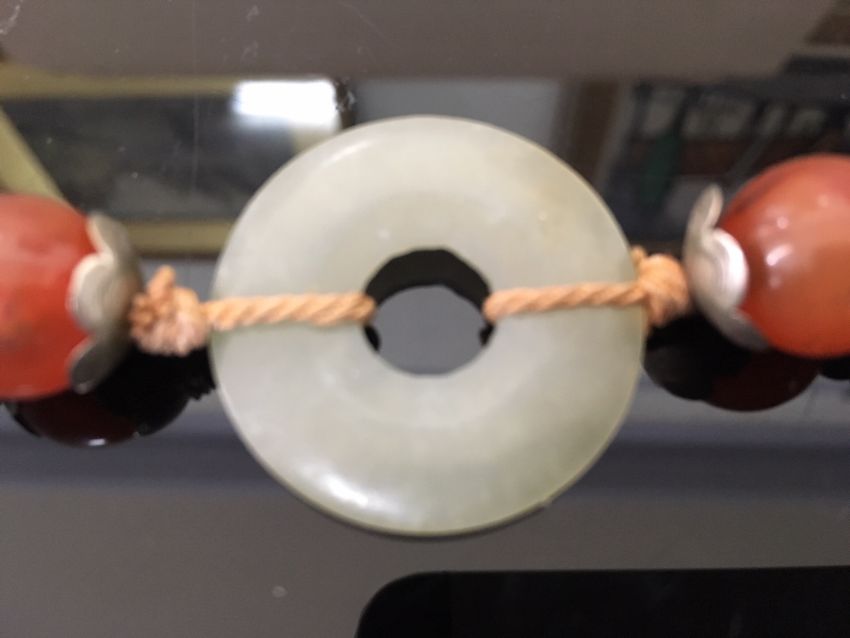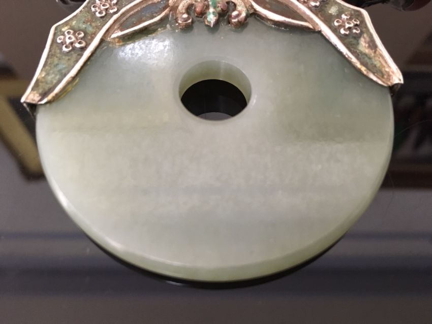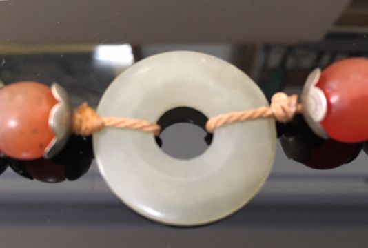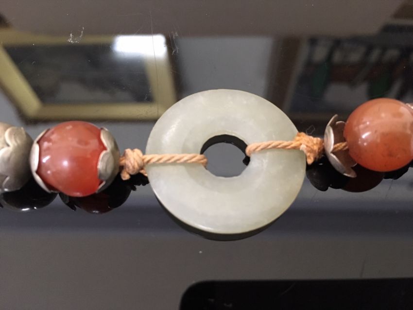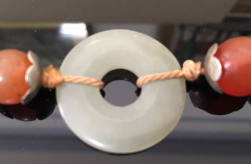 the green jade bi of even colour and mounted in an enamelled white metal mount in the form of a bat with outstretched wings, the pendant suspended from white metal and enamelled beads, two further smaller pale green jade bi rings, carnelian beads and a thick woven chain, white metal tests for silver, together with a pair of silver anvil shaped cufflinks (2)