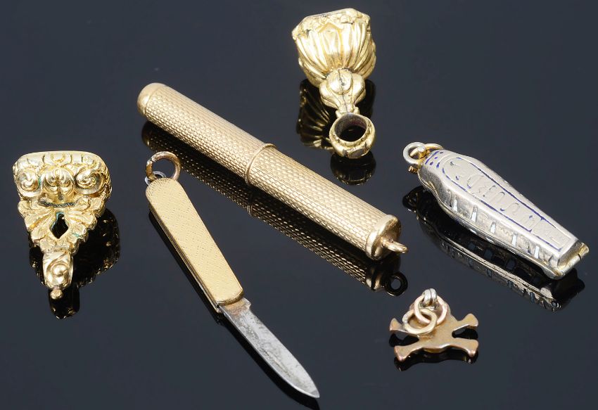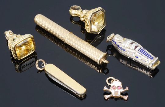 the two small scroll gold cased seals set with carved gem intaglios, together with a 9ct gold pendant toothpick with engine turned decoration, an Egyptian revival opening sarcophagus charm, a miniature opening penknife and a tiny enamel momento mori charm (6)