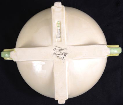 the two twin handled bowls in cream ground with brown, green and yellow liner decoration, the twin handles and four stepped feet with green highlights, the two graduated oval meat platters in matching decoration, each with printed mark to base, painted number: 1219, (4)
