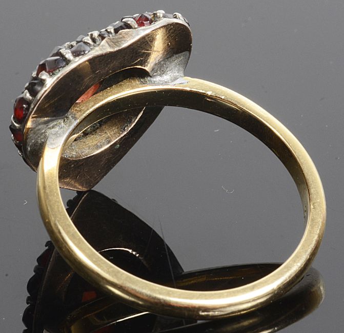 Condition: Overall good, one tiny edge garnet loose, the ring has almost certainly converted from a brooch or pendant historically, one small garnet loose.