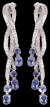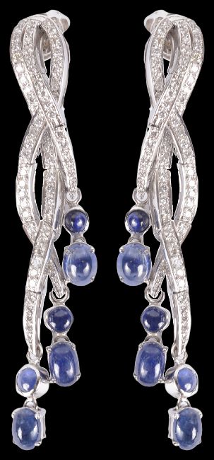 having diamond set woven 'ribbons' of varying lengths terminating in round and oval cabochon sapphires, the white metal drops fully articulated and weaving across each other, butterfly backs stamped .750 and signed indistinctly, white metal mounts test for gold