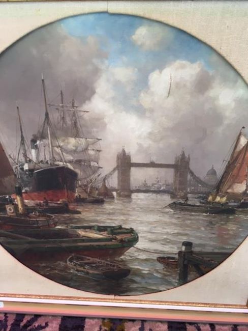 'Tower Bridge', oil on canvas, signed lower right, with circular mount in a frame.