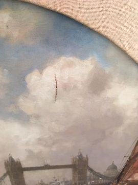 Condition: Fair to good, with minor wear to the frame, the canvas in good condition. Since the item has been on display we have noticed that is has been recently damaged and a tear is visible. PLEASE SEE PHOTOGRAPHS