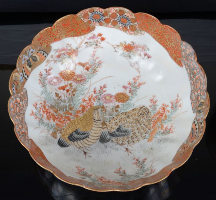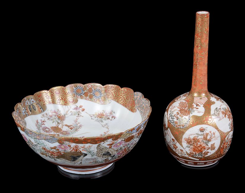 the vase typically painted in iron red heightened with gilt and decorated with vignettes of lotus flower sprays and prunus trees, the fluted bowl decorated to the centre with birds amidst flower sprays, (2)