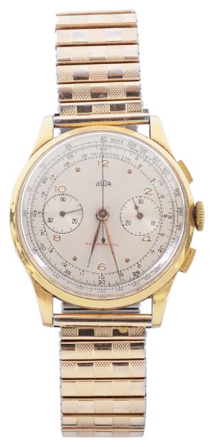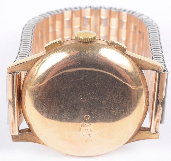 the circular dial with Arabic quarter hours, two subsidiary dials for seconds and 30 minute, in a circular 18k case, with gilt metal expandable bracelet, case back hallmarked 18K 0.750 with Helvetia mark