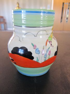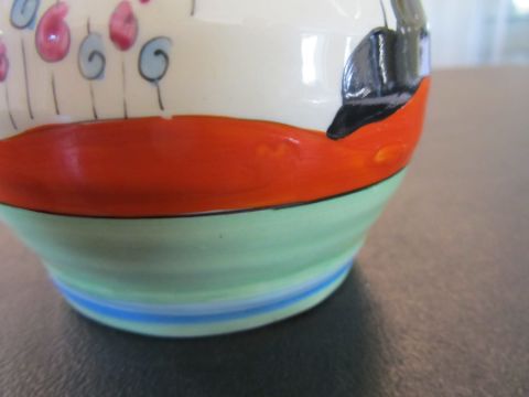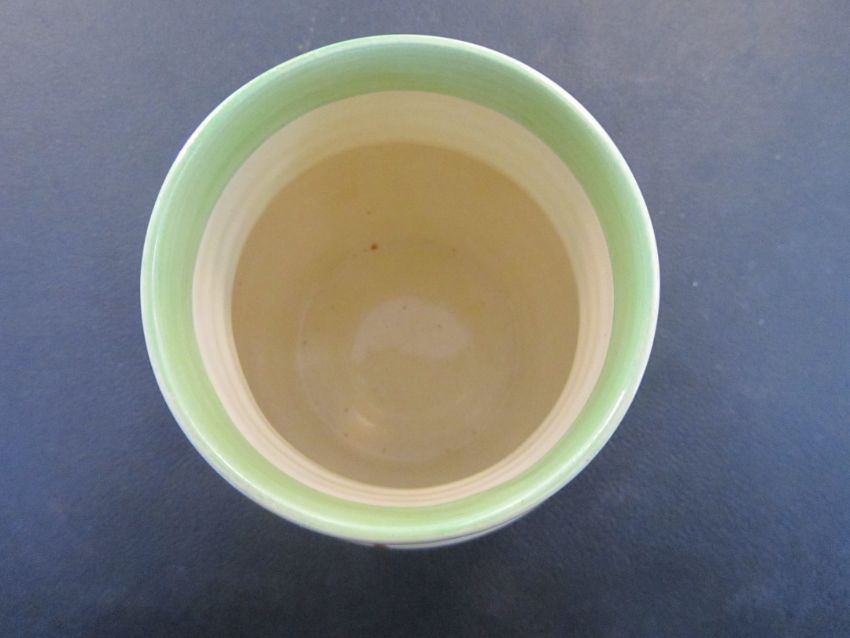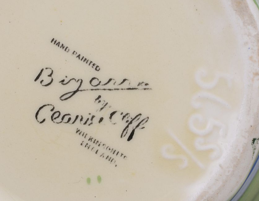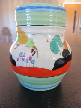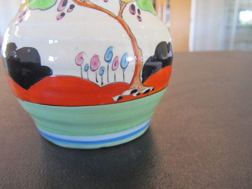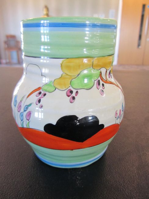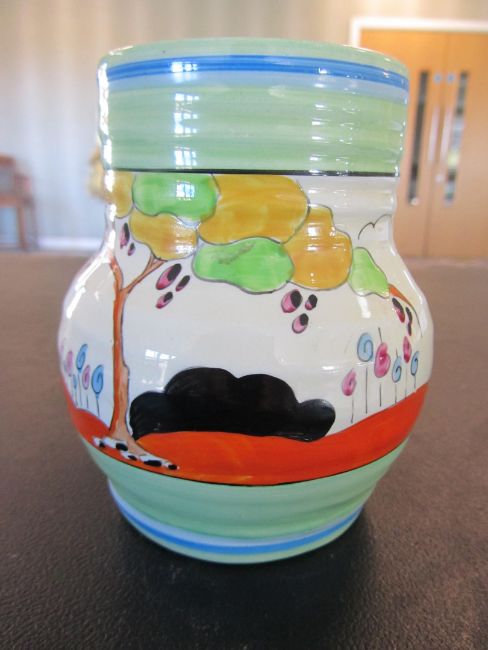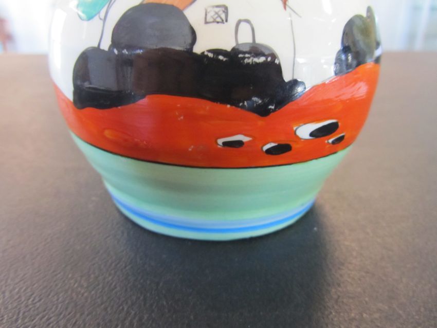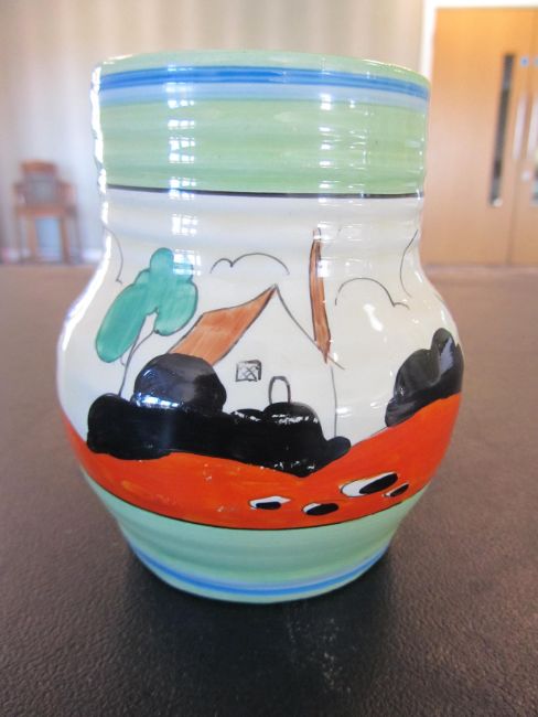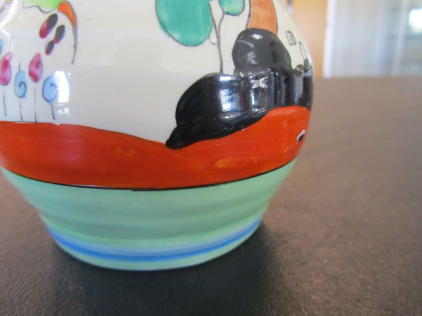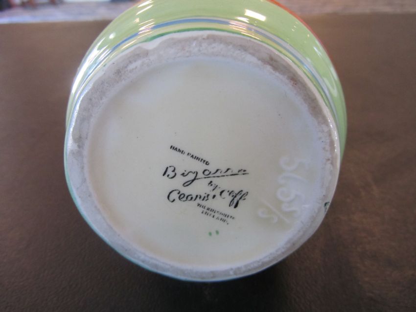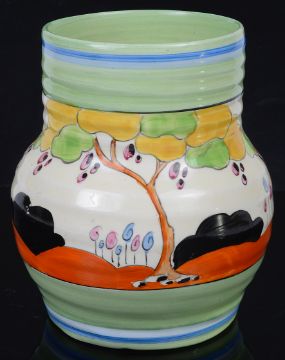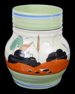 the hand painted vase with a cottage garden landscape between tonal blue and green banding, black Bizarre mark, numbered 565.
