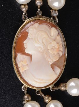 chain tests for gold, together with a simulated pearl three row necklace with silver mounted carved shell, cameo clasp (2)