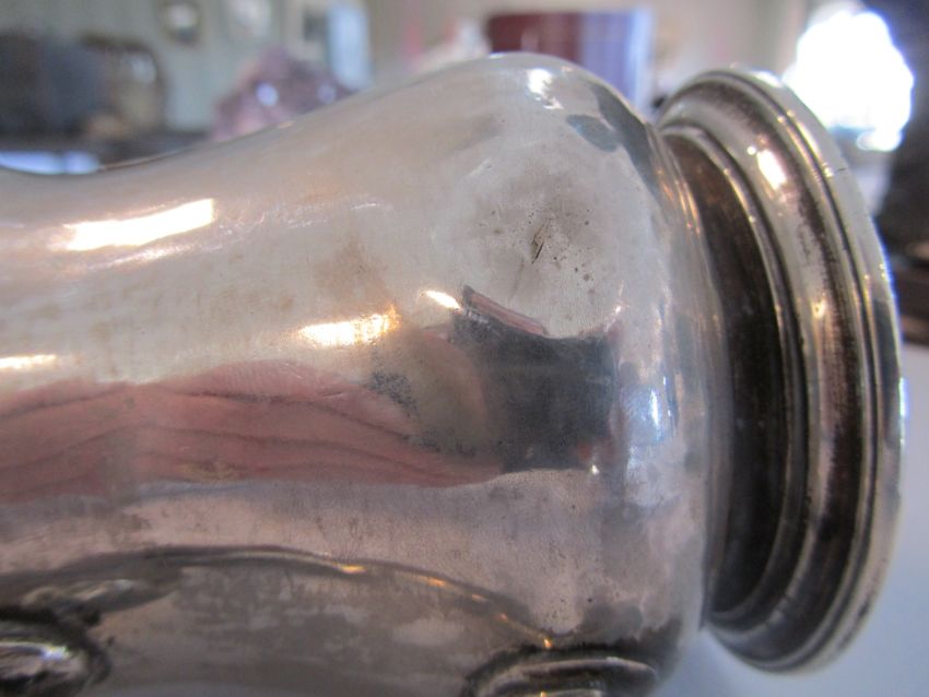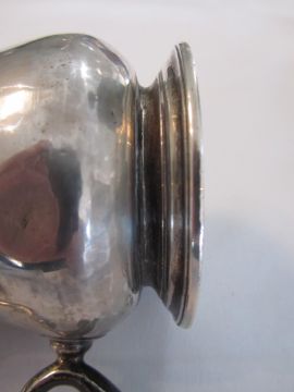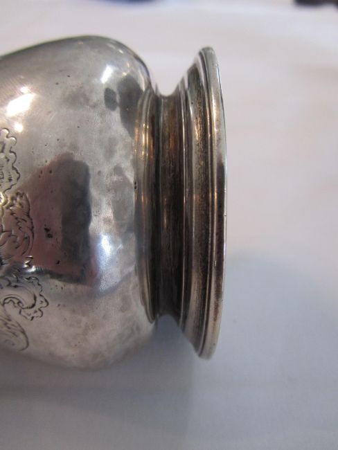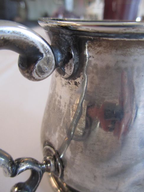 Condition: Fair, with surface dents to the baluster sides of the tankard, wear to engraved armourial on the front, the top of the handle join on the tankard has a repair, minor surface scratches on the alms dish.