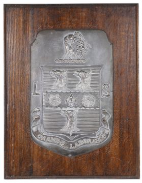 A wooden mounted shield plaque bearing coat of arms for Rugby School by Fisher and Ludlow