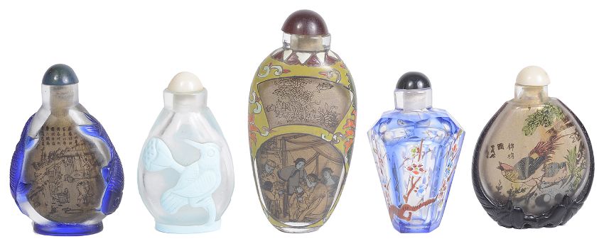 comprising two interior painted bottles, one with carved blue glass carps to either side, the other having brown carved glass overlay in the form of bats, another overlaid glass carved bottle decorated with turquoise perched birds, a clear and blue glass facetted snuff bottle of hexagonal form enamelled with coloured prunus blossom and another large contemporary inside painted snuff bottle with coloured enamel detail, all bottles with stoppers (5)