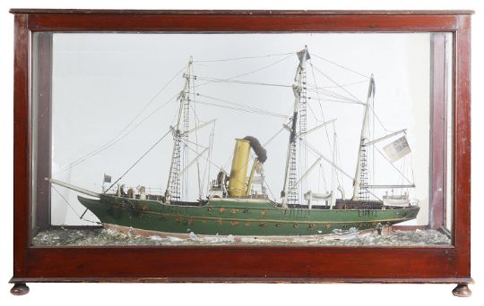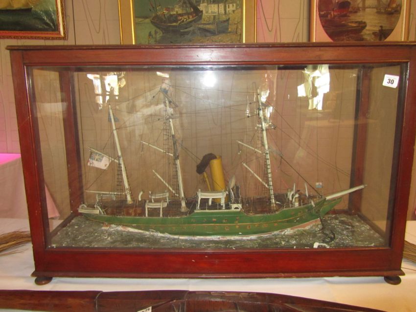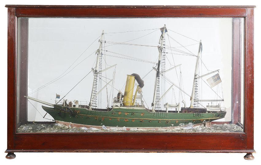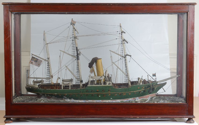 the three masted vessel on simulated sea with green painted hull and deck details including lifeboats on davits, ventilators, ship's wheel etc., contained within a mahogany glazed case