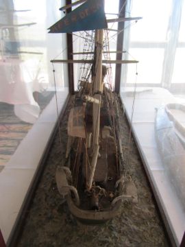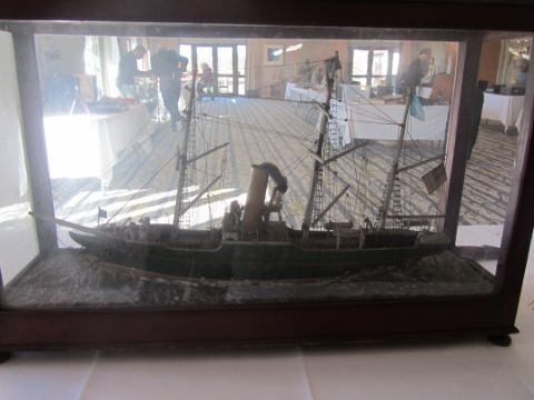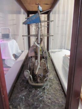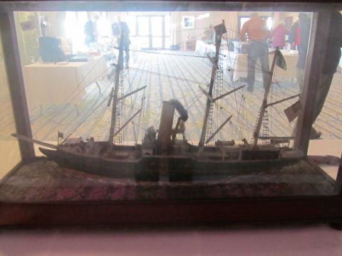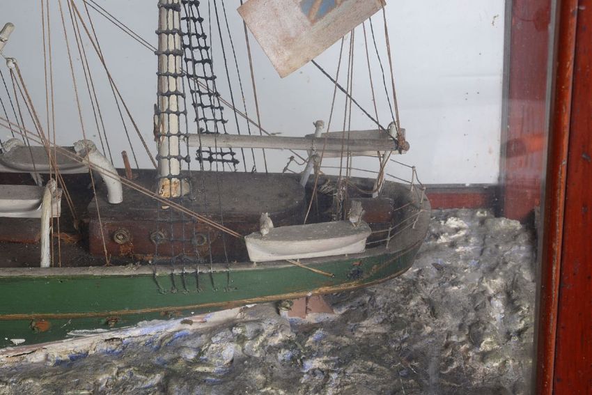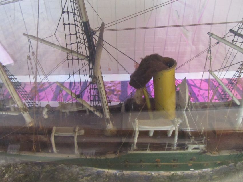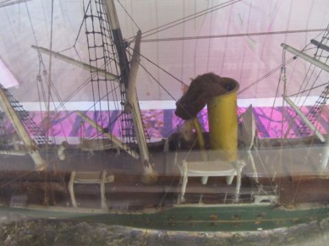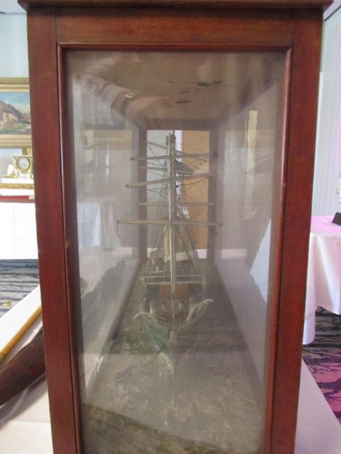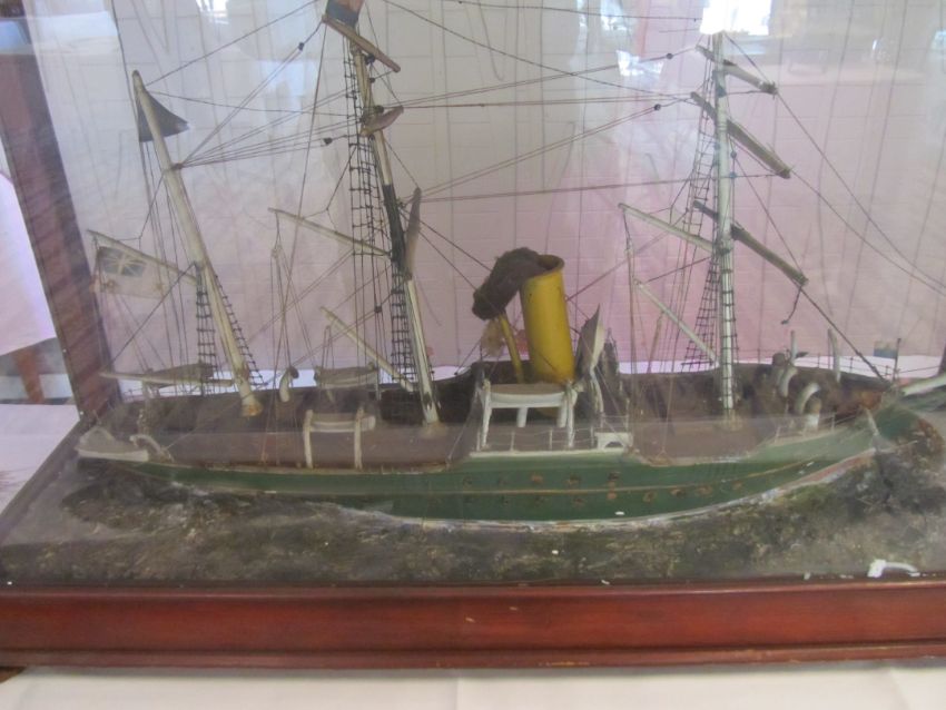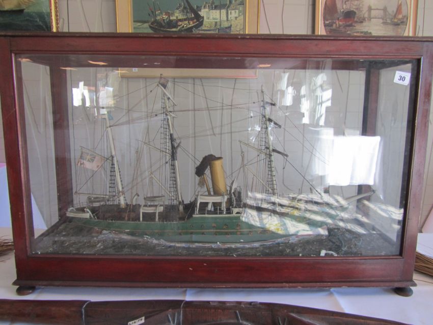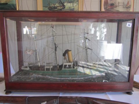 Condition: Generally in fairly worn and tidy condition. The hull has paint flaking and the masts and sails are dirty and tired. Would benefit from some restoration. Case in good overall condition. One foot detached and requires re-gluing.