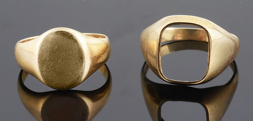 the former of oval form without engraving, fully hallmarked for 9ct gold, the latter marked for 9ct, intaglio absent mount only (2)