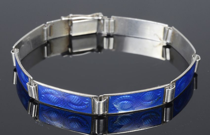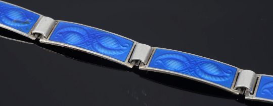 A Scandinavian silver and blue guillioche enamel panel bracelet