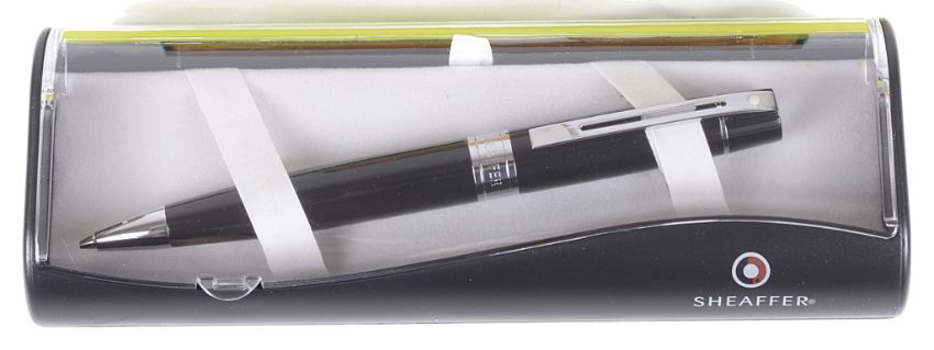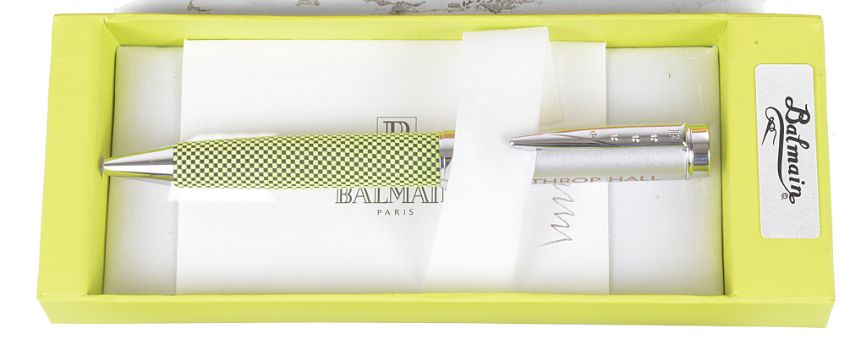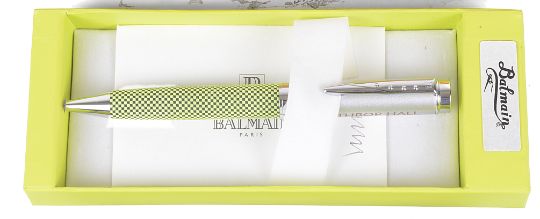 the Waterman gold plated Overlay fountain pen, with cartridge insert, 18k nib, in Waterman blue box with cardboard sleeve; the Balmain brushed steel roller ball twist pen, with green and black chequered band, with Winthrop Hall motif, in green Balmain box and the Sheaffer black twist pencil, in black Sheaffer box with cardboard sleeve, (3).