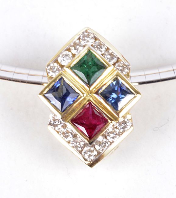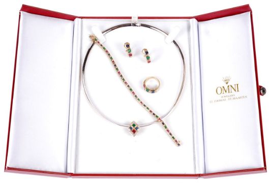 An attractive suite of contemporary Continental diamond, emerald, sapphire and ruby set jewellery